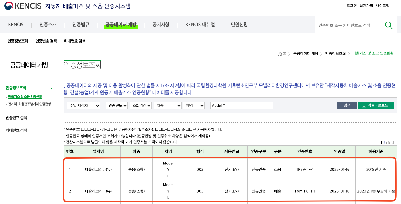 "카더라" 통신보다는 정부의 공식 데이터가 가장 정확합니다. 저 역시 과거 모델 3 하이랜드 출시 당시, 유튜브 루머만 믿고 기다리다 구매 타이밍을 놓친 경험이 있습니다. 현재 자동차 배출가스 및 소음 인증시스템(KENCIS)에서 확인되는 팩트는 다음과 같습니다.